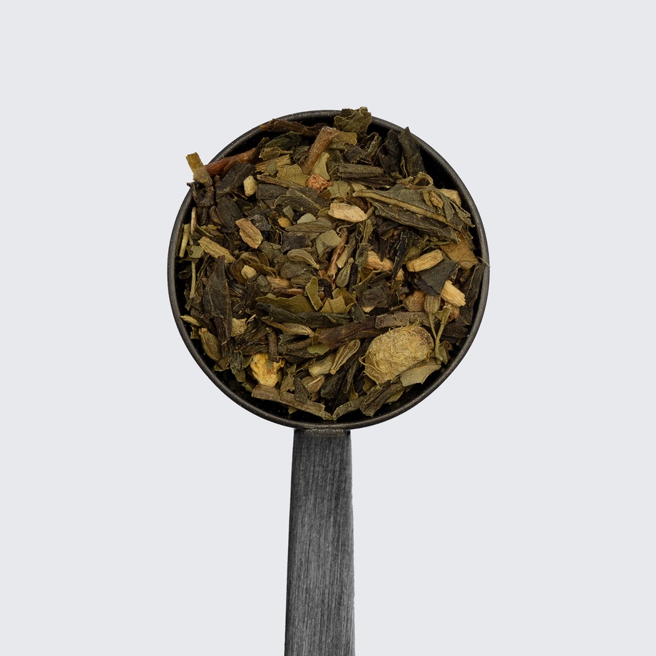 Sencha green tea, ginger, orange, clove, pepper, anise seed, cinnamon, ashwagandha, turmeric, moringa, orange extract.